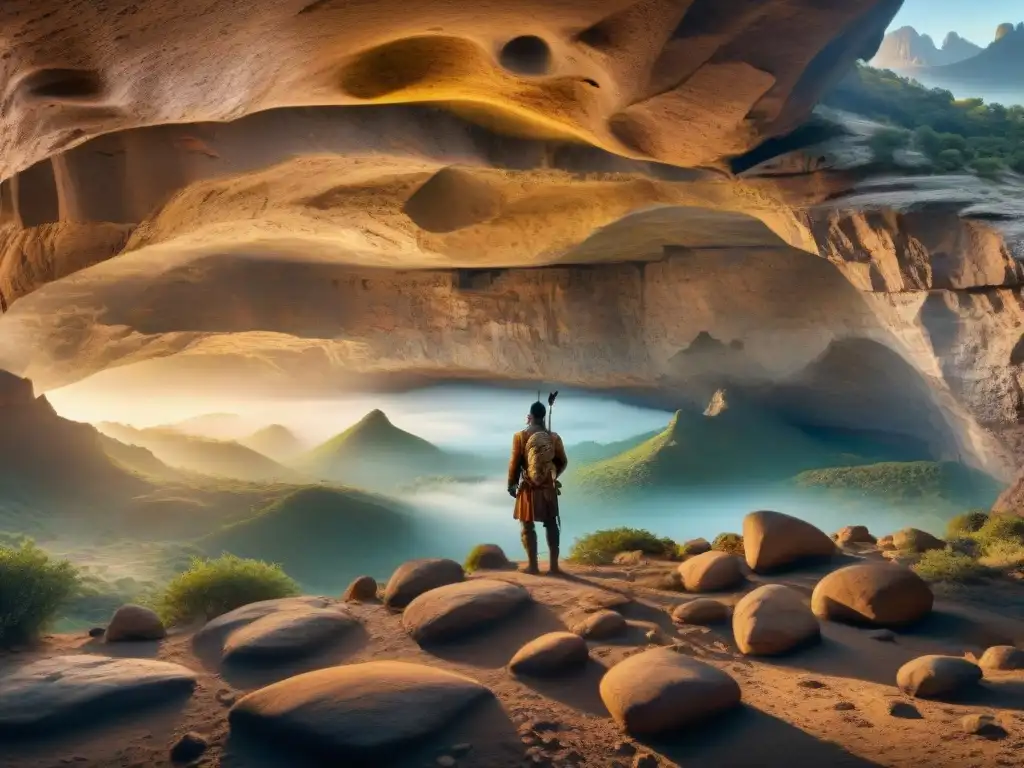 Tableta de piedra esculpida con poesía nómada ancestral, símbolos culturales en desierto al atardecer